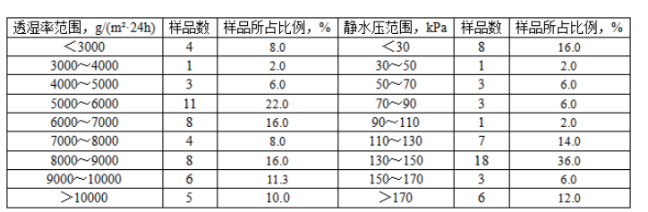 3.1 透濕率、靜水壓測(cè)試結(jié)果分布