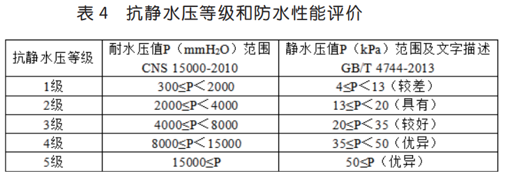可見(jiàn),防水透濕面料倒杯 - 蒸發(fā)法的透濕率基本符合正態(tài)分布,≤ 4000g/(m2·24h)的比例為10.0%,> 10000g/(m2·24h)的比例 10.0%,一半以上測(cè)試結(jié)果集中在 5000~ 9000 g/(m2·24h)。而靜水壓測(cè)試結(jié)果相對(duì)比較分散,≤ 30kPa 的比例為 16.0%,> 170kPa 的比例為 12.0%,70% 以上的測(cè)試結(jié)果大于 70kPa。以 GB/T 32614-2016《戶外運(yùn)動(dòng)服裝 沖鋒衣》中對(duì)沖鋒衣面料 I 級(jí)功能性要求而言,即洗滌前透濕率≥ 5000g/(m2·24h),靜 水 壓 ≥ 50kPa,50 塊 面 料 透 濕 率 合 格 率 為84.0%,靜水壓合格率為 82.0%,合格率基本一致。但靜水壓指標(biāo)相對(duì)更好,三分之二的樣品靜水壓> 100kPa,遠(yuǎn)遠(yuǎn)滿足標(biāo)準(zhǔn)要求,這也驗(yàn)證了靜水壓指標(biāo)通過(guò)在織物表面的涂層處理很容易符合標(biāo)準(zhǔn)要求。將 GB/T 4744-2013《紡織品 防水性能的檢測(cè)和評(píng)價(jià) 靜水壓法》及臺(tái)灣標(biāo)準(zhǔn) CNS 15000-2010《防水透濕紡織品性能評(píng)估》[8] 對(duì)靜水壓的評(píng)價(jià)性能列如表 4 所示。