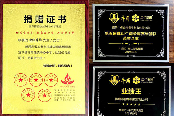 大家看一下下面的獎(jiǎng)項(xiàng)就知道睿牛制衣還是個(gè)不錯(cuò)的良心企業(yè)也是一家有實(shí)力的沖鋒衣生產(chǎn)廠家,我們的總經(jīng)理同時(shí)也是非常有愛(ài)心的,她經(jīng)常做善事來(lái)匯報(bào)社會(huì),因?yàn)樗?出生在70年代從小的生活也是很艱苦的,他非常能夠理解學(xué)生渴望讀書的那種心情,所以我們老板歐陽(yáng)月華女士特地愛(ài)心參與捐贈(zèng)宜章縣瑤崗仙鎮(zhèn)中心小學(xué)落成,凝聚萬(wàn)千愛(ài),共圓心學(xué)子夢(mèng)!還有我們總經(jīng)理系上絲帶的照片,讓大家共同把愛(ài)傳遞出去!