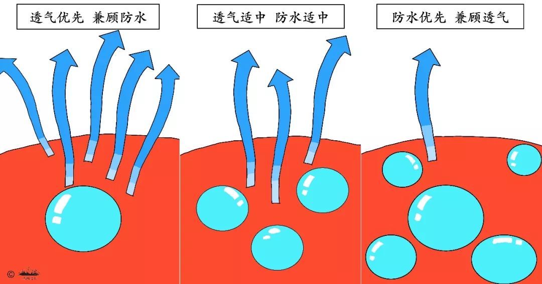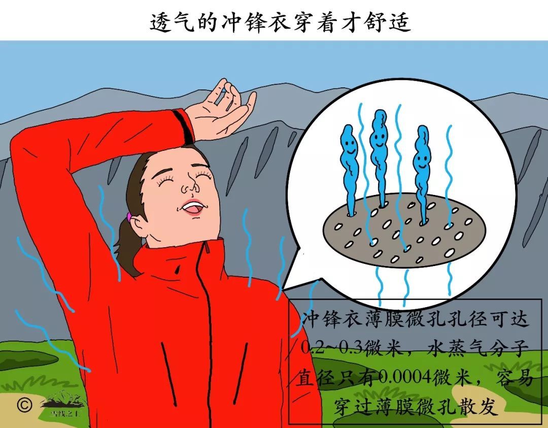透氣性關(guān)乎舒適度——人體散發(fā)的汗液以水蒸氣形式通過(guò)沖鋒衣傳導(dǎo)到外界,從而避免汗液集聚冷凝在沖鋒衣內(nèi),是沖鋒衣舒適性的關(guān)鍵。