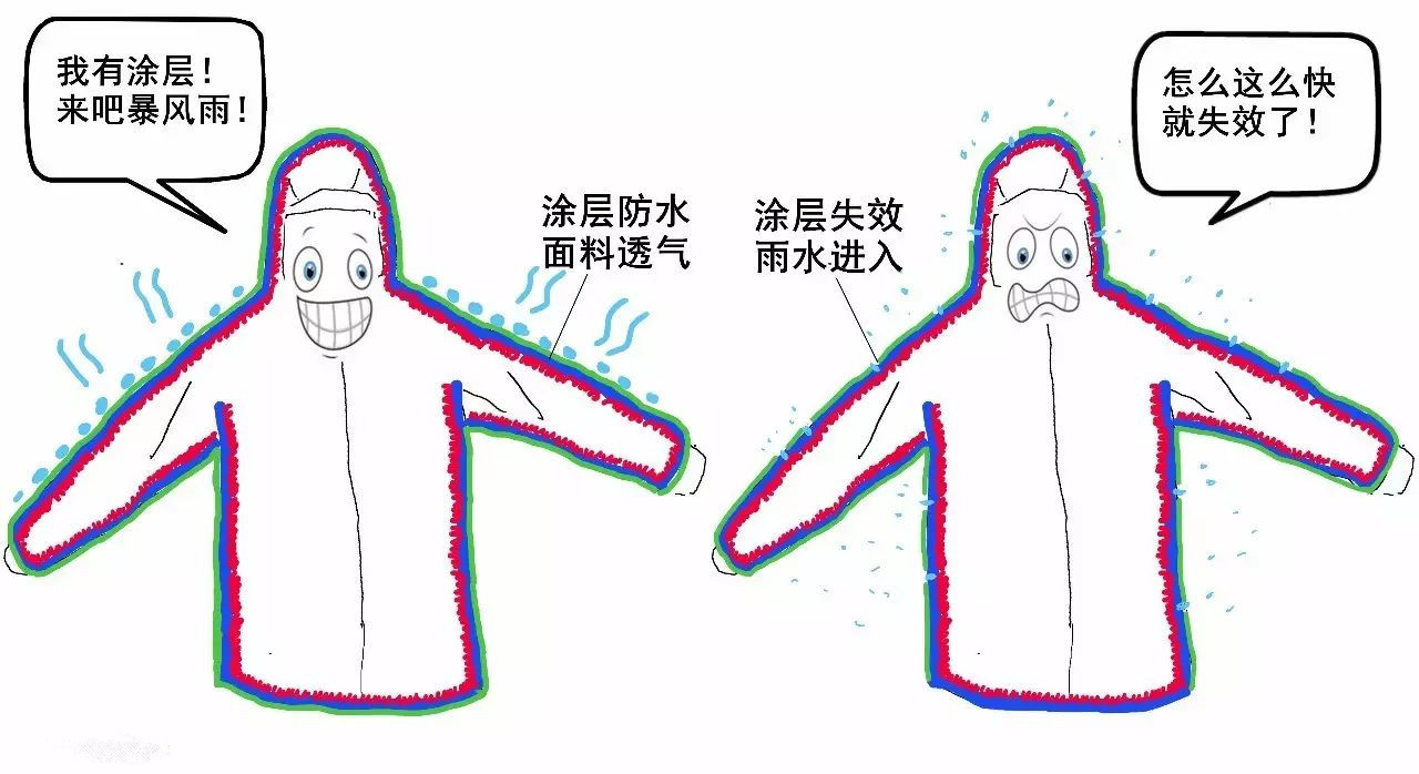 20世紀(jì)60年代中期,人們找到了一種防水涂層,對面料進(jìn)行了一定的改進(jìn)。當(dāng)面料經(jīng)過涂層處理后,雨水就像掉落在荷葉的表面一樣,結(jié)成小水珠。同時(shí)涂層很輕薄,水蒸氣通過面料縫隙仍然能排出。