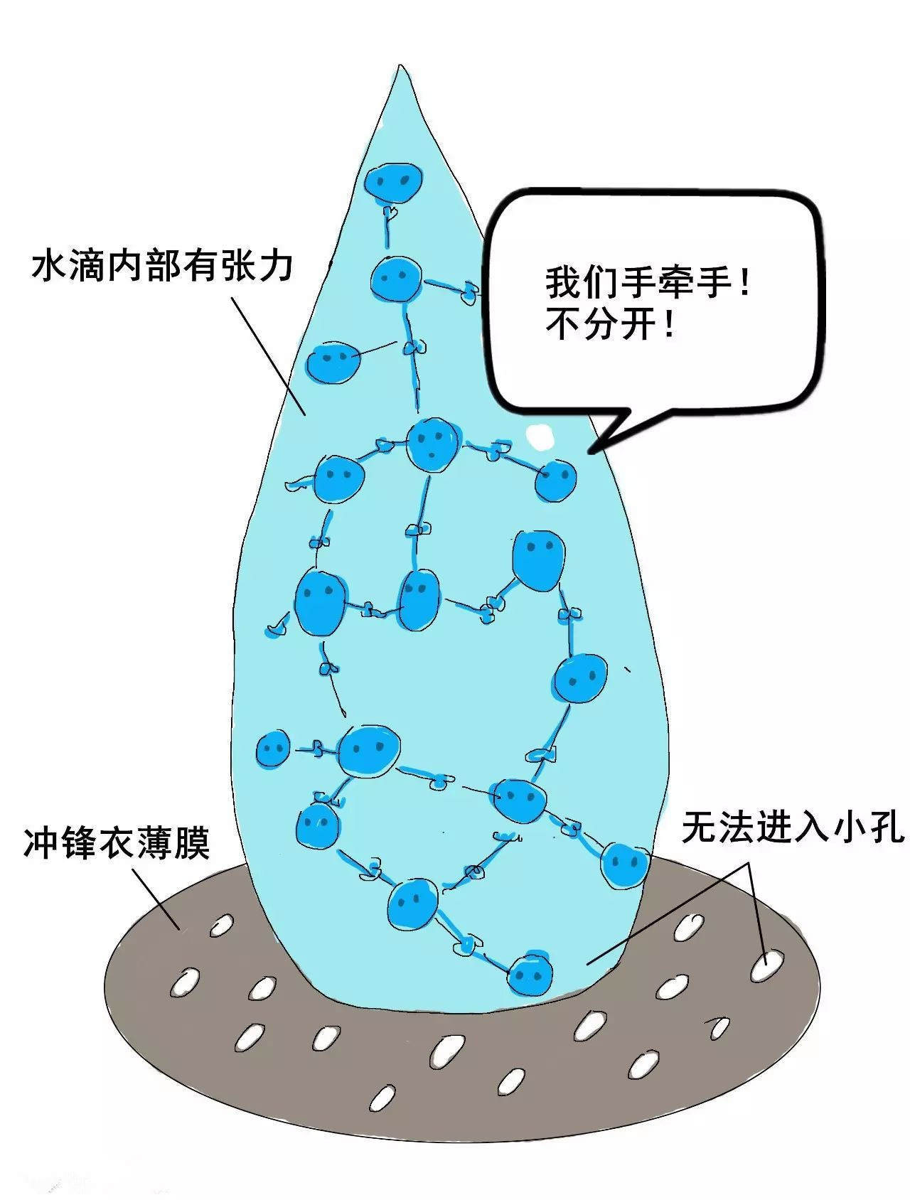 2)沖鋒衣的薄膜的孔很小,比雨滴小很多,所以雨滴進(jìn)不去小孔。