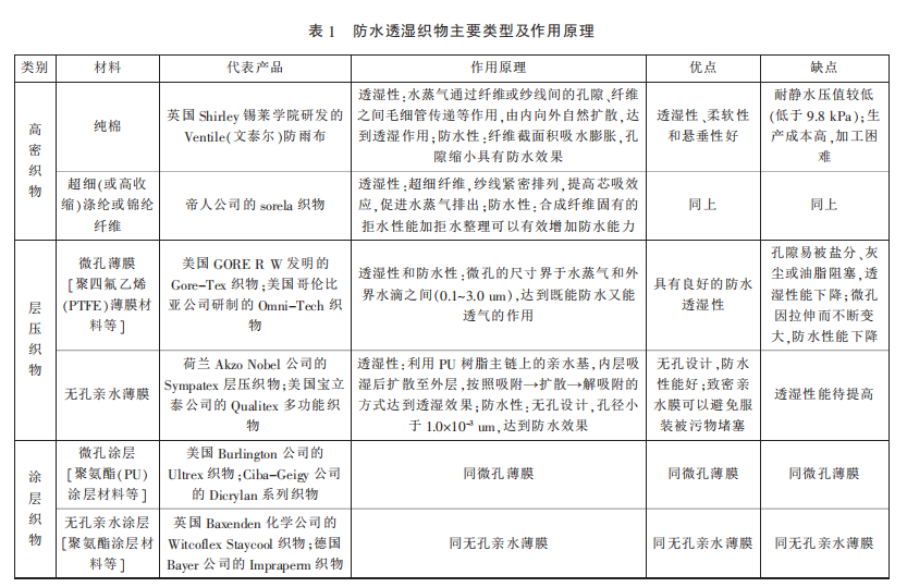 優(yōu)質(zhì)防水透濕面料可以在一定水壓下不被雨水潤濕或滲透,同時將人體散發(fā)的汗液蒸汽擴散或傳導(dǎo)到外界,降低人體微氣候區(qū)的濕度,增強穿著的舒適度和安全性。自1940年,研制出第一個防水透濕織物,目前,防水透濕面料已獲長足發(fā)展。根據(jù)加工工藝,防水透濕面料可分為高密織物、層壓織物和涂層織物,見表1。