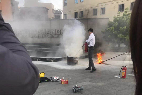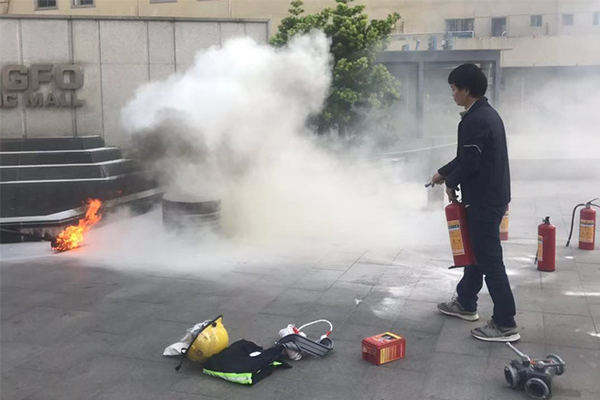 6.在距離火焰兩米的地方,右手用力壓下壓把,左手拿著噴管左右擺動(dòng),噴射干粉覆蓋整個(gè)燃燒區(qū)