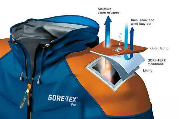 (1)一種是EPTFE復膜的微孔型面料,目前國內多是GORE-TEX、DENTIK、EVENT、3TO1-TEX這幾種。它防水透氣的功能是在服裝的外面料上復合一層微孔薄膜,其中的微孔比水滴分子小,又比氣體分子大,可以在阻擋雨水的同時揮發(fā)自身的汗氣。
