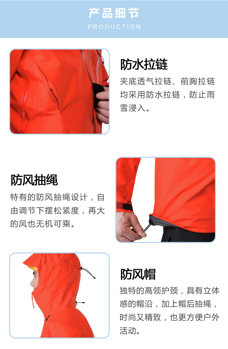 防風(fēng)帽:獨(dú)特的高領(lǐng)護(hù)頸,具有立體感的帽沿,加上帽后抽繩,時尚又精致,更方便戶外活動,專業(yè)沖鋒衣貼牌代工。