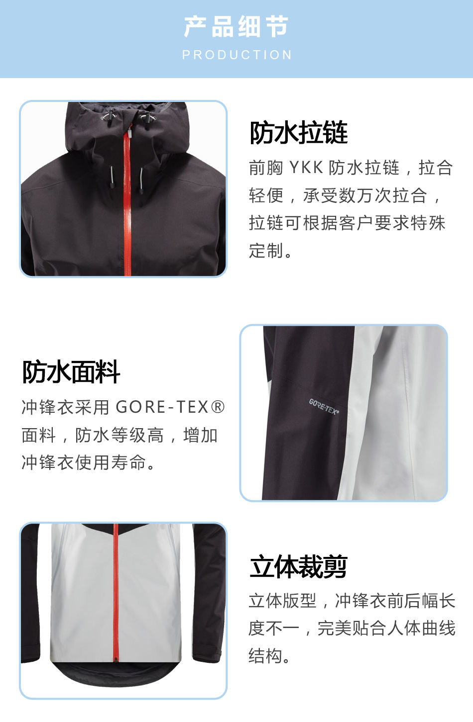 防水面料:沖鋒衣采用GORE-TEX?面料,防水等級高,增加沖鋒衣使用壽命。