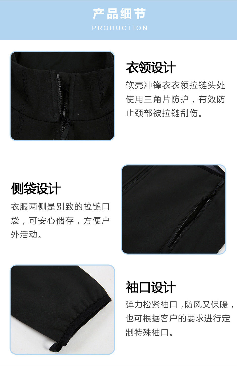 袖口設計:彈力松緊袖口,防風又保暖,也可根據(jù)客戶的要求進行軟殼沖鋒衣定制其的特殊袖口。