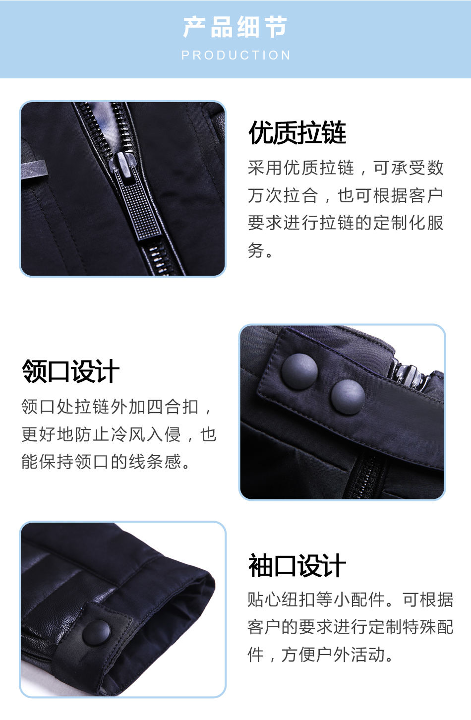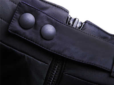 領(lǐng)口設(shè)計:領(lǐng)口處拉鏈外加四合扣,更好地防止冷風(fēng)入侵,也能保持領(lǐng)口的線條感。