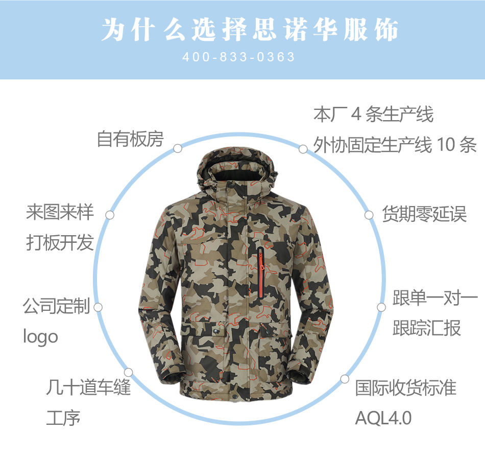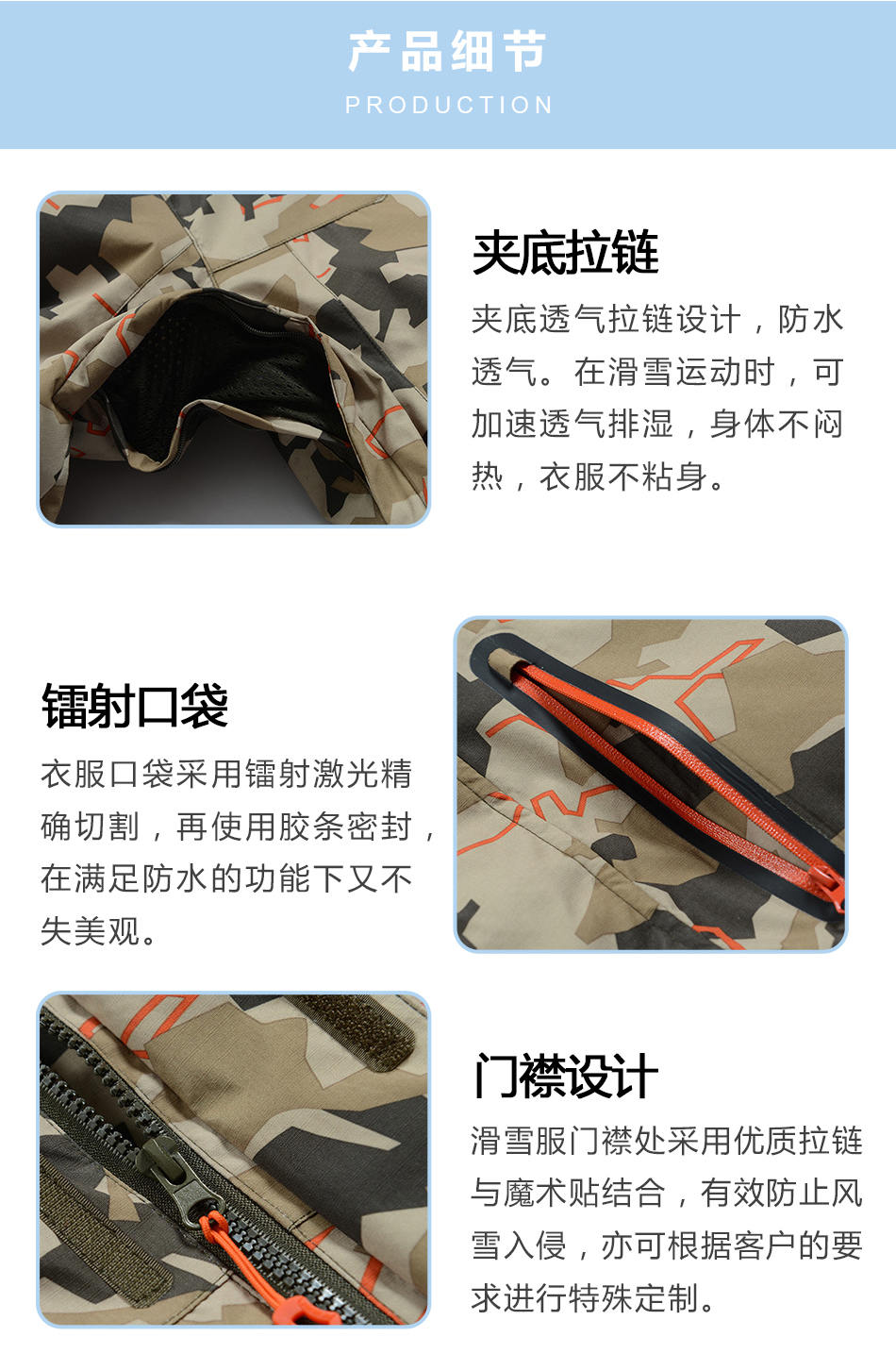 門(mén)襟設(shè)計(jì):滑雪服門(mén)襟處采用優(yōu)質(zhì)拉鏈與魔術(shù)貼結(jié)合,有效防止風(fēng)雪入侵,亦可根據(jù)客戶的要求進(jìn)行特殊定制。
