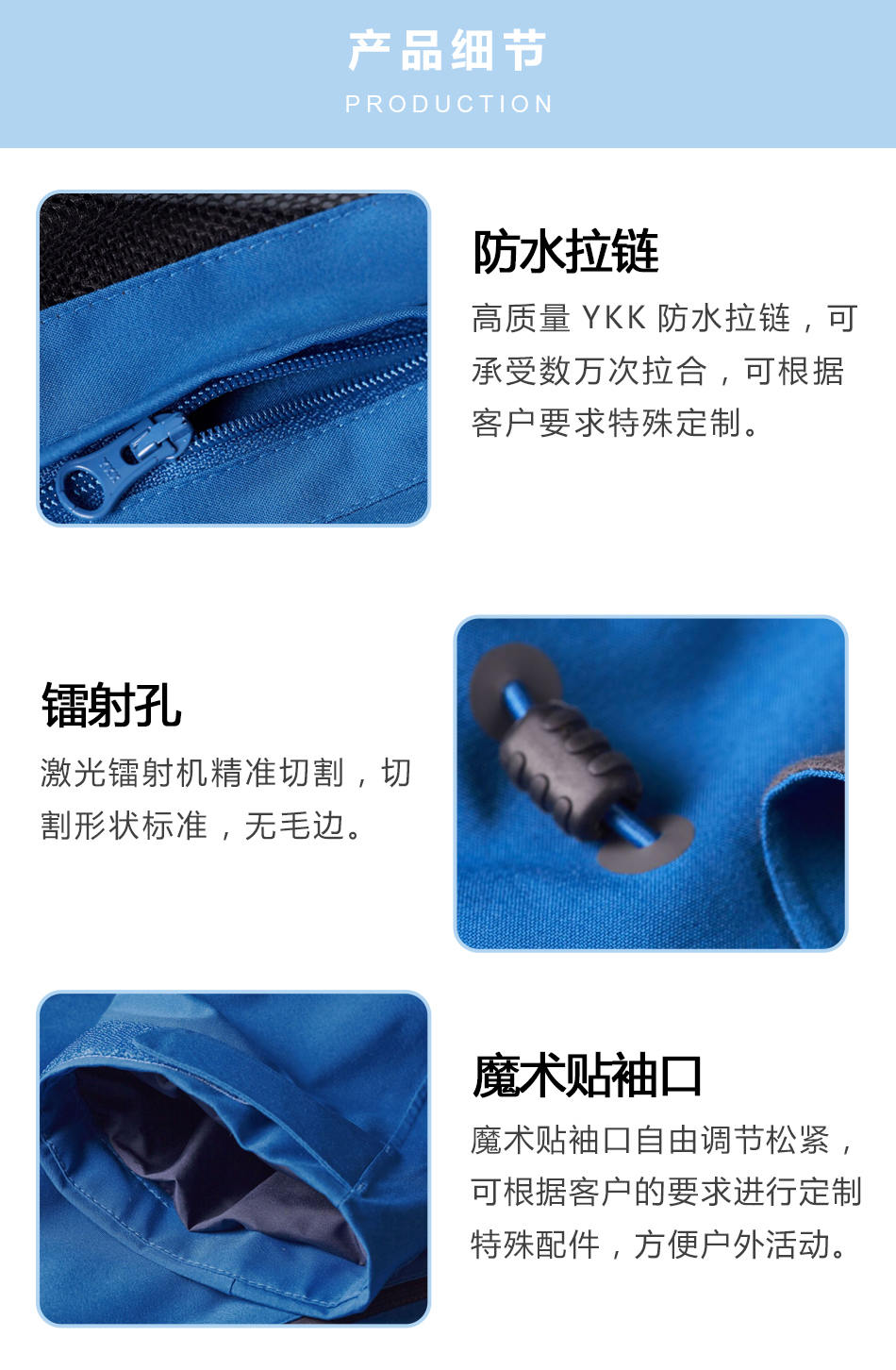 魔術(shù)貼袖口:魔術(shù)貼袖口自由調(diào)節(jié)松緊,可根據(jù)客戶的要求進行定制特殊配件,方便戶外活動。